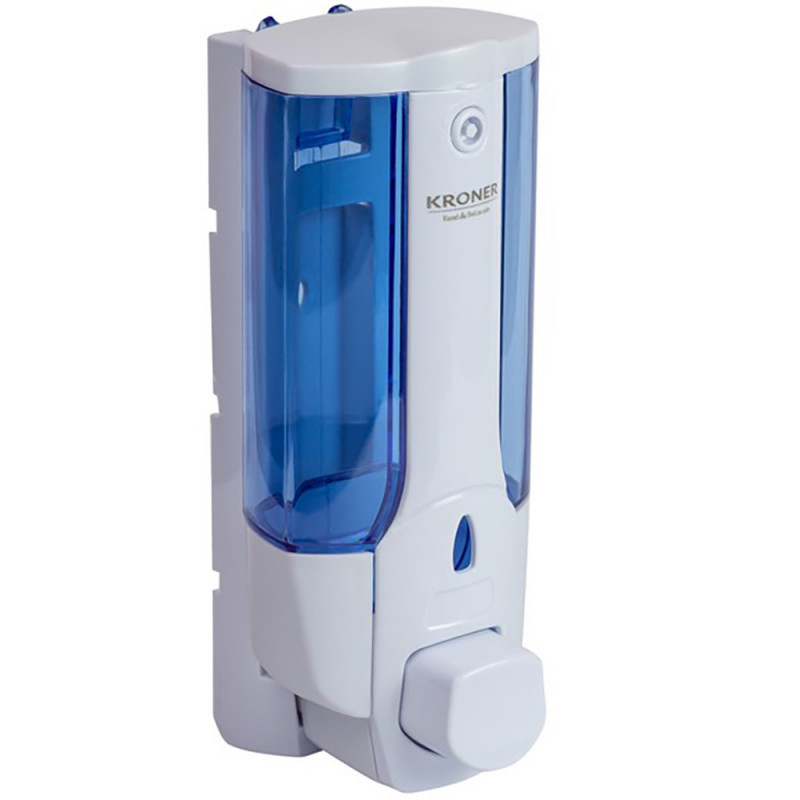Диспенсер для рідкого мила KRM Rizze-ACP403 від Kroner з одинарним пластиковим резервуаром розрахований на 380 мл. Подання мила відбувається в разі натискання на кнопку. Диспенсер кріпиться на стіну в будь-якому зручному місці шурупами, які входять до комплекту. Віконця вироблені з прозорого блакитного пластику для контролю залишку мила. Пластик стійкий до вологи та простий в очищенні.