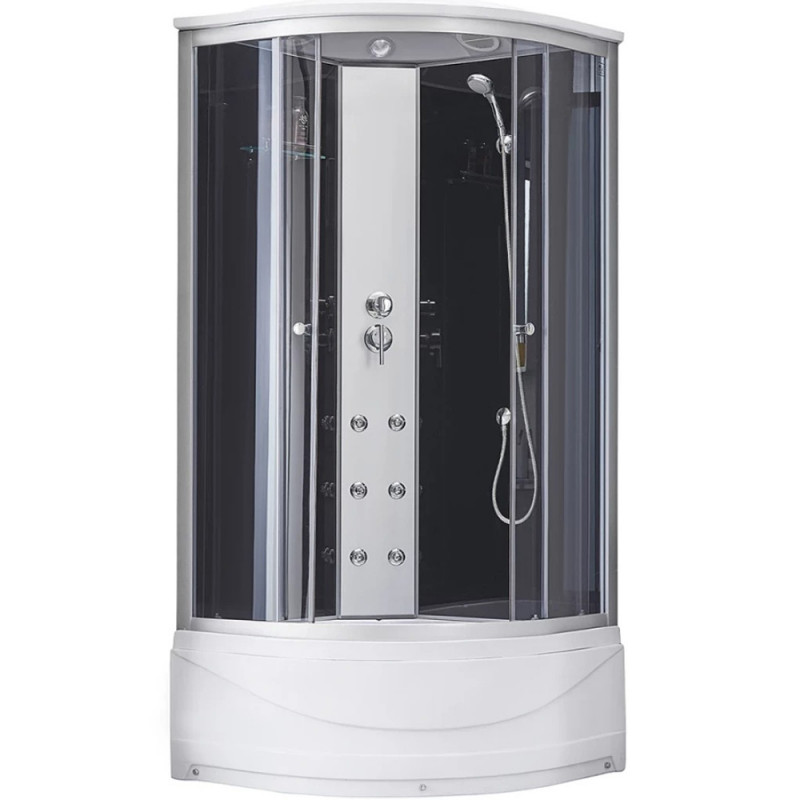 До комплекту душового боксу входить велика кількість необхідних елементів, таких як сифон, двері, ручки, ролики, профіль, кришка, задні стінки, душова панель з гідромасажними форсунками, змішувач, лійка для ручного душу, лійка для верхнього душу, душовий шланг, кронштейн для ручного душу, шлангове під‘єднання, ніжки, комплект кріпильних деталей та полиця. Це забезпечує повну функціональність та зручність використання.