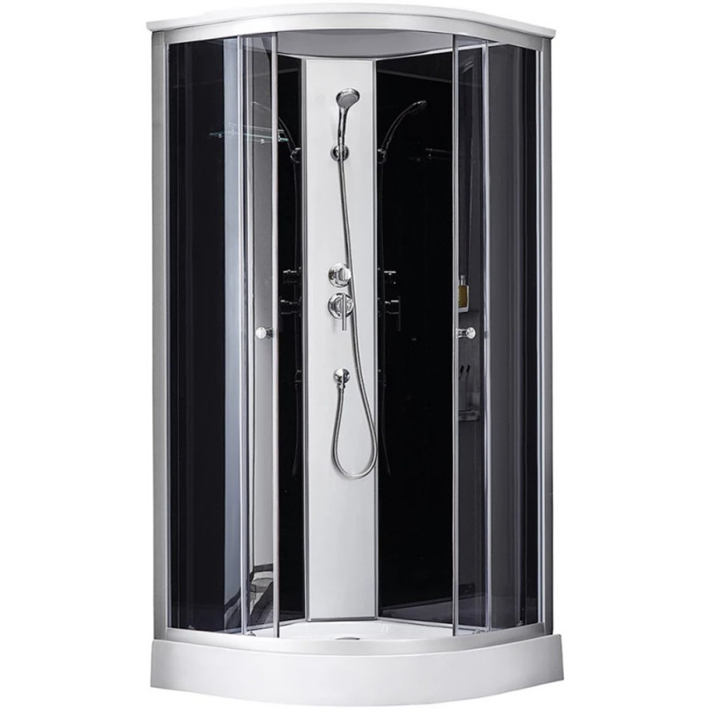 До комплекту душового боксу входить велика кількість необхідних елементів, таких як сифон, двері, ручки, ролики, профіль, кришка, задні стінки, душова панель, змішувач, лійка для ручного душу, лійка для верхнього душу, душовий шланг, кронштейн для ручного душу, шлангове підключення, ніжки, комплект кріпильних деталей та полиця. Це робить його готовим до установки та використання.