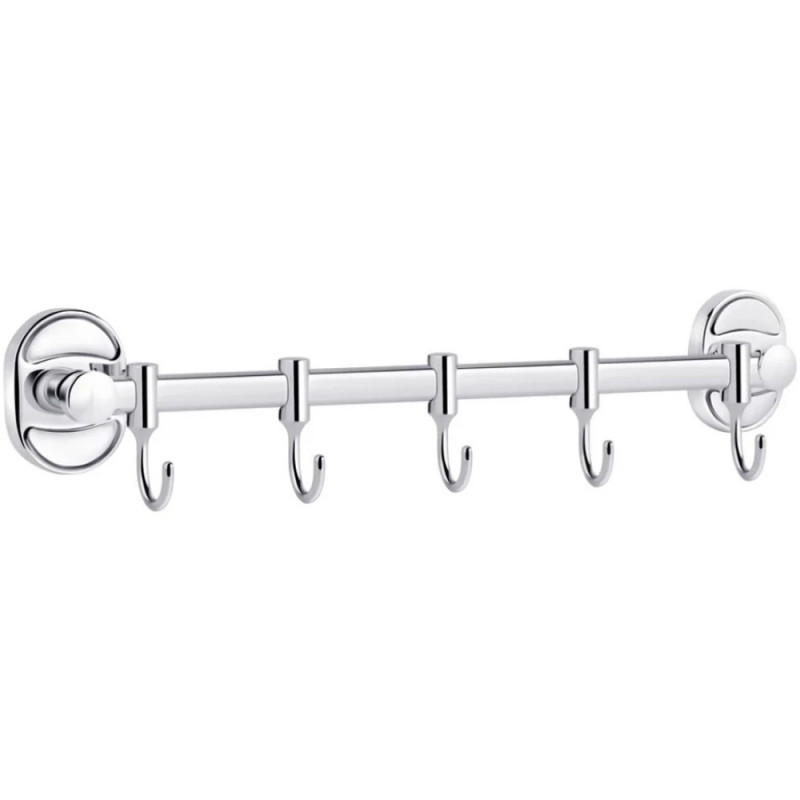 Тримач для рушників і халатів Kroner KRM Elbe-ACC2914-5 виготовлений у формі стрижня з п'ятьма пересувними гачками на ньому. Тримач для рушників виготовлений із міцного металу з хромованою поверхнею. Приховане кріплення дає змогу зберегти оздобу, а хромоване покриття запобіжить утворенню корозії та бруду. Тримач для рушників кріпиться на стіні на бажаній висоті.