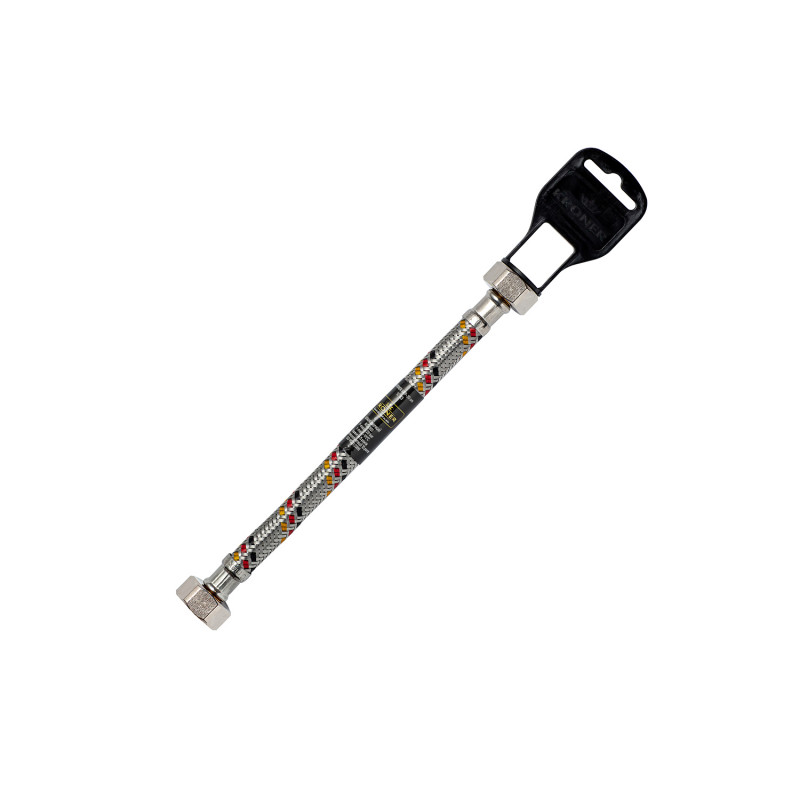 Гнучкі шланги ТМ KRONER призначені для підключення до системи водопостачання сантехнічних виробів: змішувачів, проточних електричних та газових водонагрівачів, унітазів, бойлерів та ін. Шланги виготовляються із EPDM-гуми високої якості. Обплетення шланга та обжим виготовлені з нержавіючої сталі марки SUS 301. Гайки, штуцера та сердечники виготовлені з високоякісної латуні марки ЛС58-3. При температурі 95 ℃ максимальний робочий тиск 20 бар. Тиск на розрив 60 бар при температурі до 60 ℃.