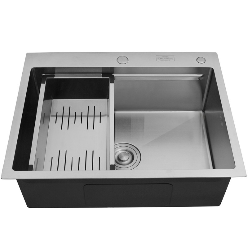 Кухонна мийка Kroner KRP Gebürstet - 6350HM - це високоякісне рішення для вашої кухні, призначене для полегшення повсякденних завдань при приготуванні їжі та збиранні. Ця мийка пропонує ряд зручних характеристик та довговічних матеріалів, які зроблять вашу кухню більш функціональною та естетичною. Основні характеристики: Матеріал та колір: мийка виготовлена з нержавіючої сталі SUS201, забезпечуючи міцність та довговічність. Колір мийки - сталь, що надає вашій кухні сучасного та стильного вигляду. Форма: Прямокутна форма миття робить її зручною для безлічі завдань, включаючи миття посуду та приготування продуктів. Розмір та отвори: Діаметр зливу становить 90 мм, що полегшує злив води та запобігає засміченню. У мийці також передбачені отвори під змішувач для дозатора миючого засобу. Сифон і коландер: Мийка поставляється з сифоном, обладнаним знімним глибоким кошиком, який запобігає засміченню зливної труби сміттям. Коландер (кошик для фруктів чи овочів) спростить процес підготовки продуктів. Монтаж: Мийка має інтегрований спосіб монтажу, що робить її установку простішою та естетичнішою. Шумоізоляція та антиконденсат: Мийка повністю покрита шумоізоляцією та антиконденсатом, що знижує шум при використанні та запобігає утворенню конденсату, захищаючи при цьому ваші меблі та кухонні шафи. Гарантія: Kroner надає гарантію на миття протягом 36 місяців, забезпечуючи вам спокій та впевненість у якості продукту. Це миття - ідеальне доповнення до вашої кухні, забезпечуючи функціональність, стиль та надійність протягом багатьох років. Вона легко очищається, підходить для різноманітних завдань та стане надійним помічником у вашій кулінарній роботі.