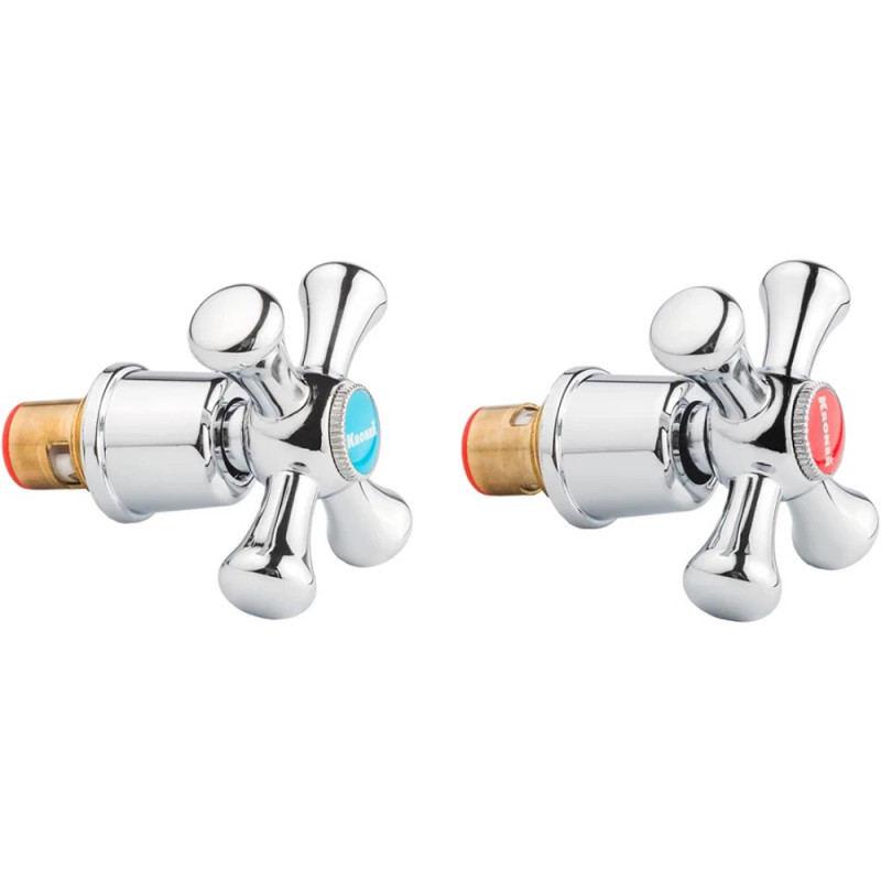 Ручки з керамічною буксою Kroner KRM-C985 (пара) являє собою два хромованих вентиля. Вони виготовлені з високоякісної латуні, тому мають тривалий термін експлуатації та стануть чудовою заміною зношеним або неякісним буксам. Використовуються як запірний механізм для відкриття/закриття та регулювання потоку води, що подається з водопроводу. Для встановлення передбачено діаметр підключення 1/2".