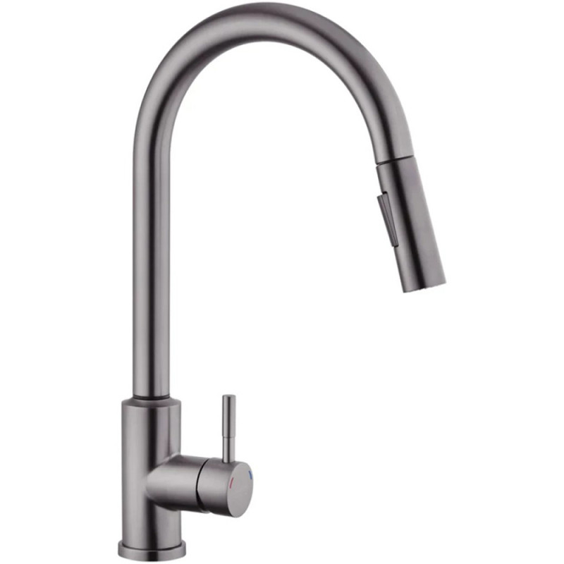 Змішувач має лаконічний дизайн та високу функціональність. Висувна лійка має шарнір, що забезпечує обертання на 360 градусів. Два режими розпилення – від потокового струменя без бризок до потужного струменя душу – дозволяють ефективно виконувати різні завдання, такі як ополіскування посуду або видалення забруднень.