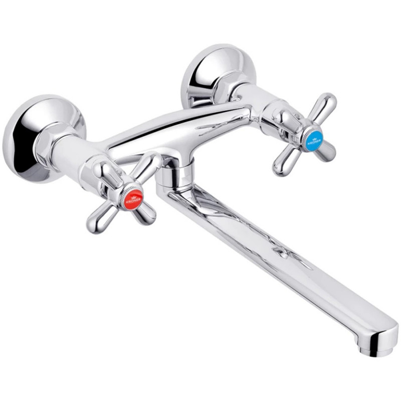 Змішувач для кухні Kroner KRP Royce-C040 настінна модель, що відрізняється сучасним дизайном та надійністю. Латунне пристрій з глянсовою хромованою поверхнею естетично та довговічно. Виконаний у класичному стилі, з вентильними ручками для перемикання потоку холодної та гарячої води. Монтаж здійснюється за допомогою ексцентриків, що забезпечують максимальне прилягання до труб та знижують рівень шуму.